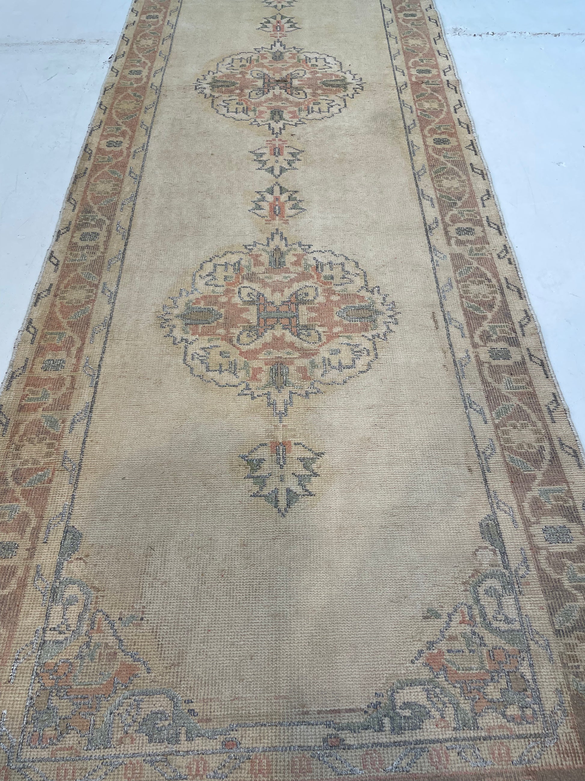 Hand-Knotted Wool Runner Turkish Oushak 3'5" x 12'